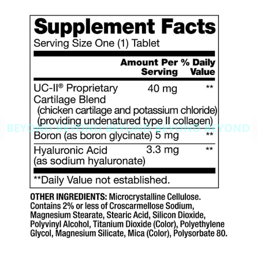 - 40mg UC-II® undenatured type II collagen per tablet. Plus Boron & Hyaluronic Acid.