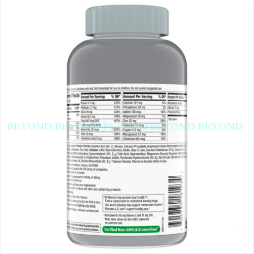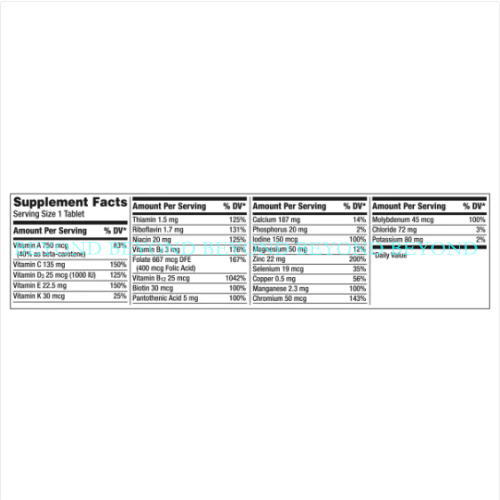 Ingredients: Calcium Carbonate, Potassium Chloride, Ascorbic Acid (Vitamin C), Dibasic Calcium Phosphate, Magnesium Oxide, Microcrystalline Cellulose, DL-alpha Tocopheryl Acetate (Vitamin E), Maltodextrin, Zinc Oxide. Contains <2%: Beta-Carotene, Biotin, Blue 2 Lake, Calcium Pantothenate (Vitamin B5), Cholecalciferol (Vitamin D3), Chromium Picolinate, Copper Sulfate, Crospovidone, Cyanocobalamin (Vitamin B12), Folic Acid, Hypromellose, Magnesium Stearate, Manganese Sulfate, Medium-Chain Triglycerides, Niacinamide, Phytonadione (Vitamin K), Polydextrose, Potassium Iodide, Pyridoxine Hydrochloride (Vitamin B6), Red 40 Lake, Riboflavin (Vitamin B2), Silicon Dioxide, Sodium Molybdate, Sodium Selenate, Talc, Thiamine Mononitrate (Vitamin B1), Titanium Dioxide, Vitamin A Acetate, Yellow 6 Lake.