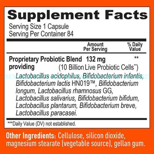 - Each capsule contains 10 Billion Live Cells of a Proprietary Probiotic Blend of Lactobacillus and Bifidobacterium strains.